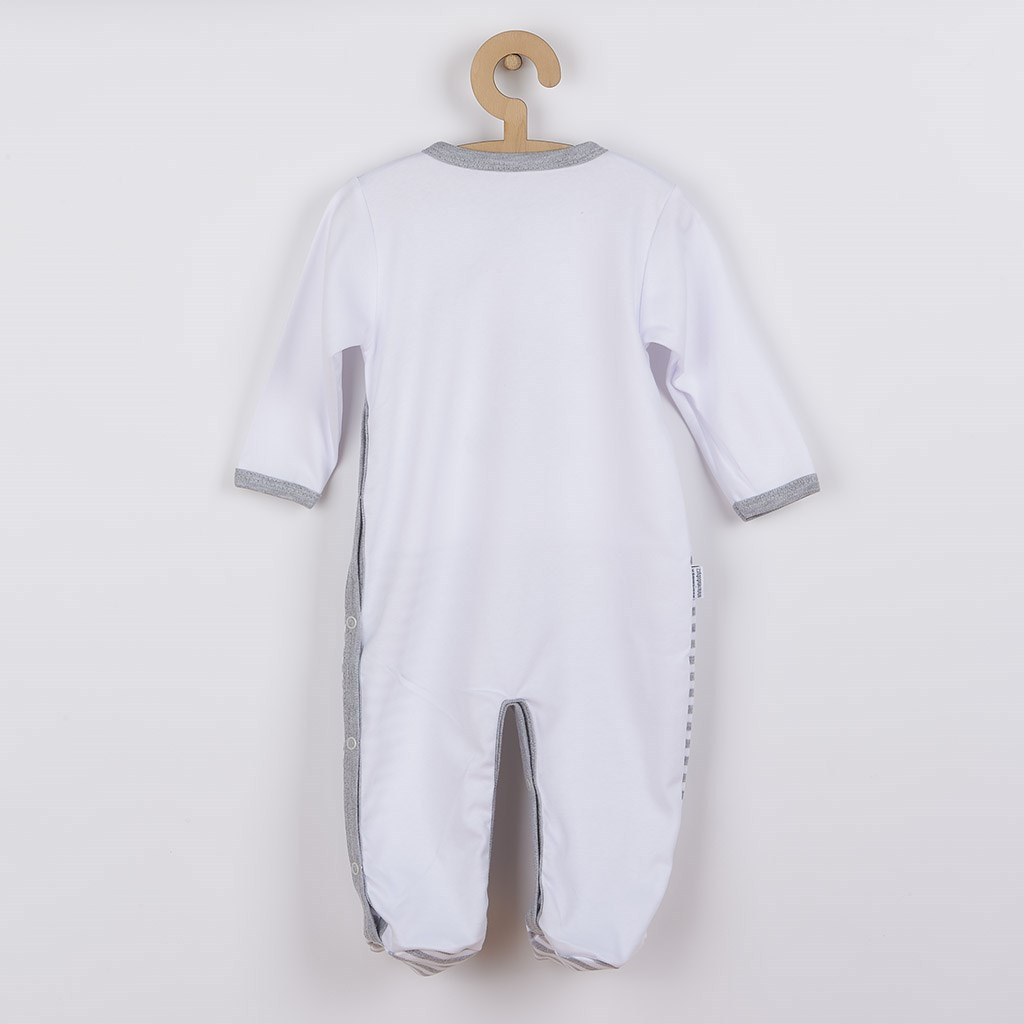 Baba kezeslábas New Baby Zebra exclusive kisbabák számára. A kezeslábas aranyos hímzett zebra képpel van díszítve és az alsó része csíkos. Teljes hosszában és az ülepénél patentos. A kollekció nagyon kellemes, puha és minőségi anyagból készült. Anyag: 100% pamut.