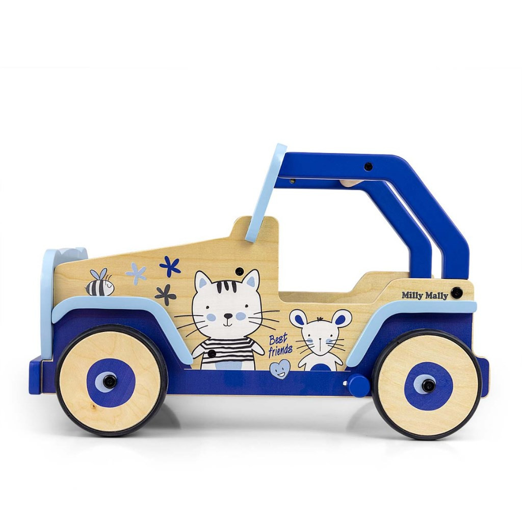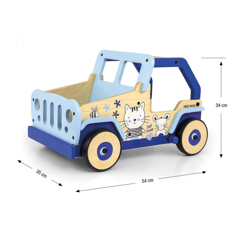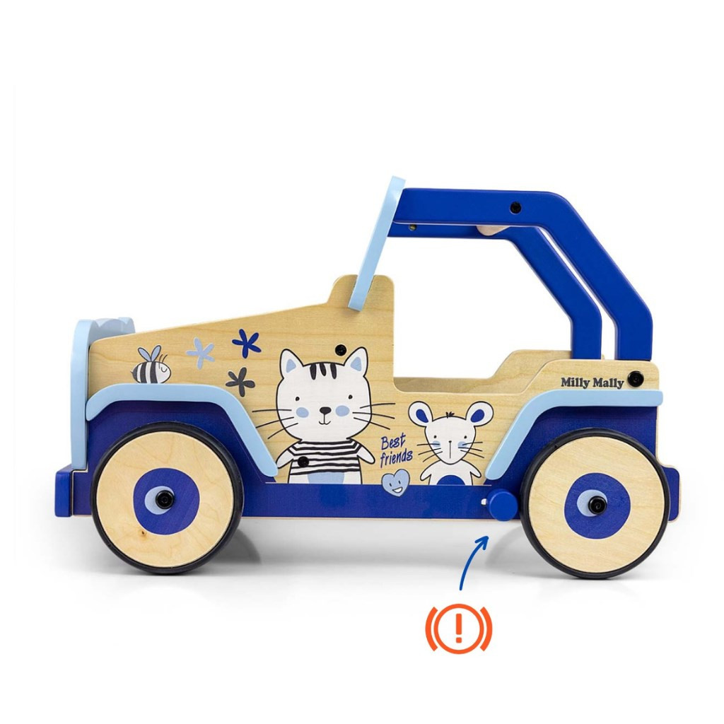 Ez a legendás terepjárók ihlette járássegítő kiváló minőségű fából és környezetbarát anyagokból készült. A kerékborítások puha TPR műanyagból készültek, amely rugalmas és tartós, és lehetővé teszi a használatát minden felületen sérülés és karcolás nélkül. Nem tartalmaznak lágyítószereket és környezetbarátak.
