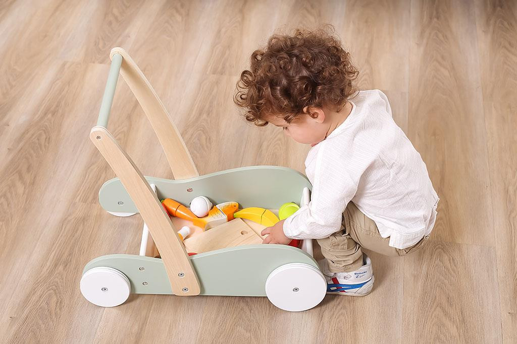 Az egyszerű kialakítású játék nagy, csúszásmentes kerekekkel és stabil, masszív fogantyúval is rendelkezik. A nagy tárolórekesz lehetővé teszi a különböző méretű és mennyiségű játékok szállítását.