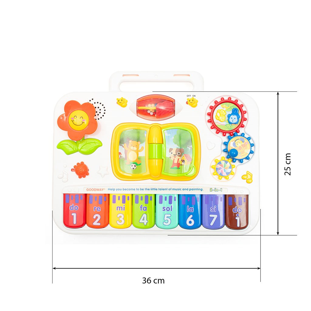 Zenélő zongora különféle hangokkal és dallamokkal, amelyek fejlesztik a hallást és a zenei képességeket.